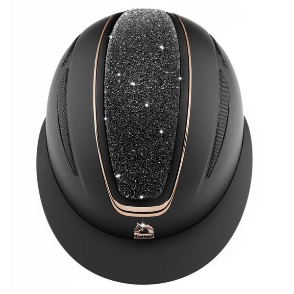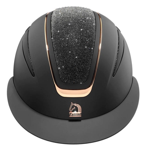 Le nouveau casque de luxe Tattini avec profils brillants or rose, doté d’une plaque super brillante avec cristaux et d’une toute nouvelle personnalisation : le logo Tattini profilé or rose.
