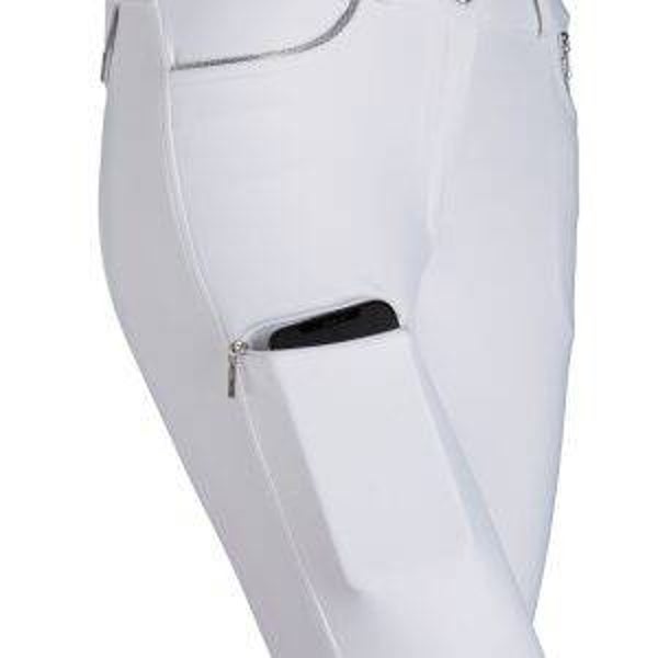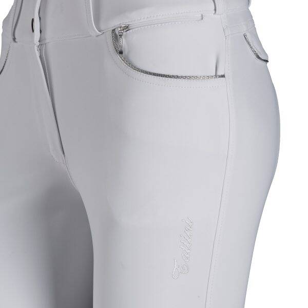 Les pantalons de concours Anthurium Tattini se distinguent par des détails élégants : des bordures tressées en lurex sur les poches et le nouveau design du logo Tattini pour les patchs en silicone aux genoux. Coupe arrière anatomique, insert élastique à la cheville. Poches avant et petite poche zippée, pratique poche zippée pour téléphone portable. Deux fausses poches arrière et logo Tattini sur le passant de ceinture arrière.