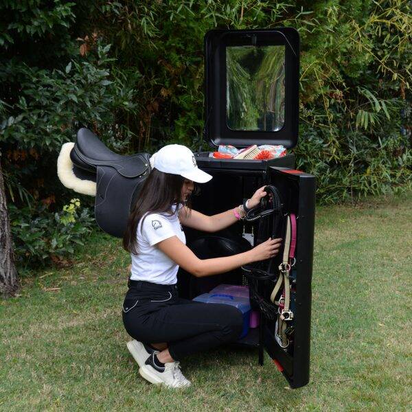 À l’intérieur se trouvent également deux porte-selles, qui peuvent être démontés si nécessaire, et latéralement, il y a deux crochets porte-bride de chaque côté; il est également très utile le porte-selle amovible où vous pouvez placer la selle.